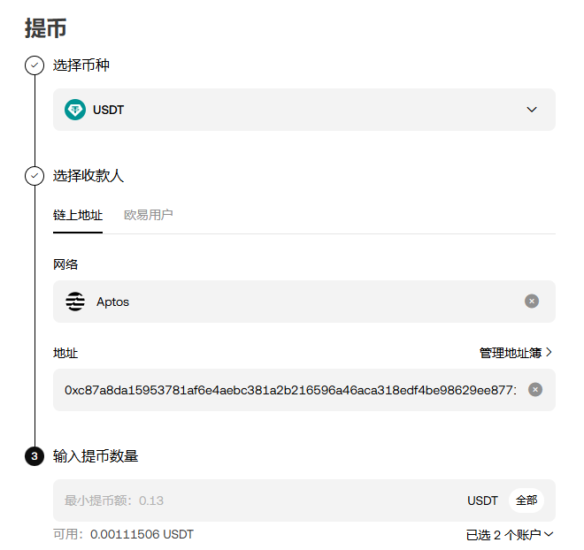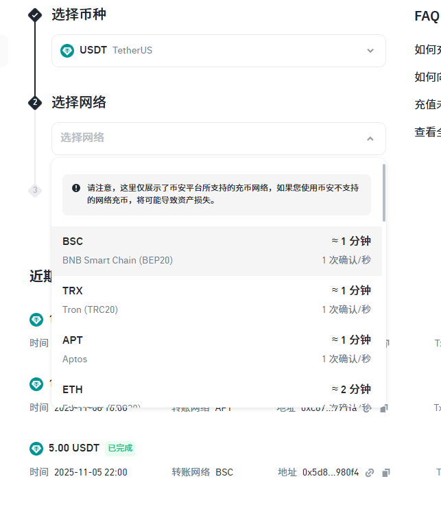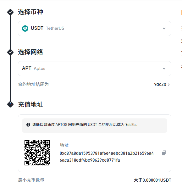 选择资产—-usdt —-交易所(因为我们用币安交易所) 选 aptos (便宜)