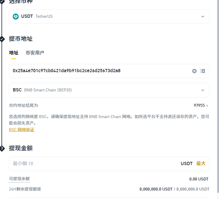 步骤一:找到币安交易所的 usdt收款地址 (erc20 trc20 pol 等都行)